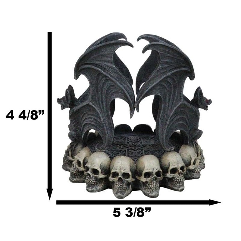 - This Gothic Bats And Skulls sculpture is 4.5" tall, 5.25" long and 5.25" deep. It weighs about 1 pound. Holds standard wine bottle or candles up to 3" diameter.