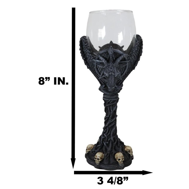 - This Baphomet Wine Goblet measures 8" tall and about 3.5" Long and 3.5" Wide approximately. Goblet capacity is 7 ounces.