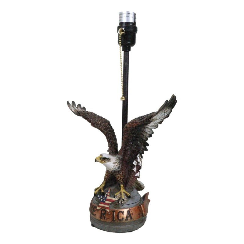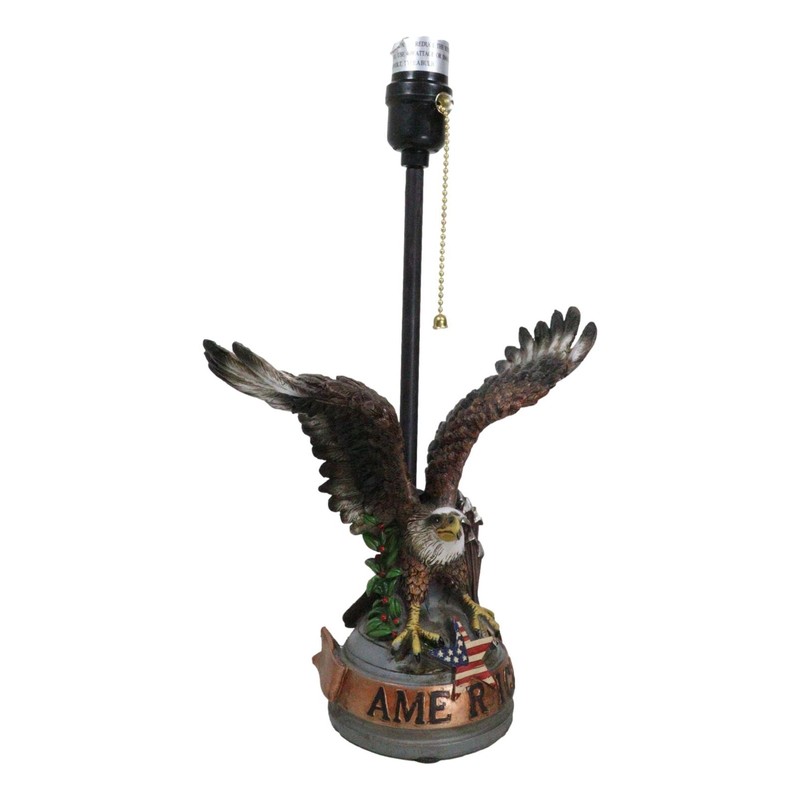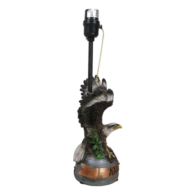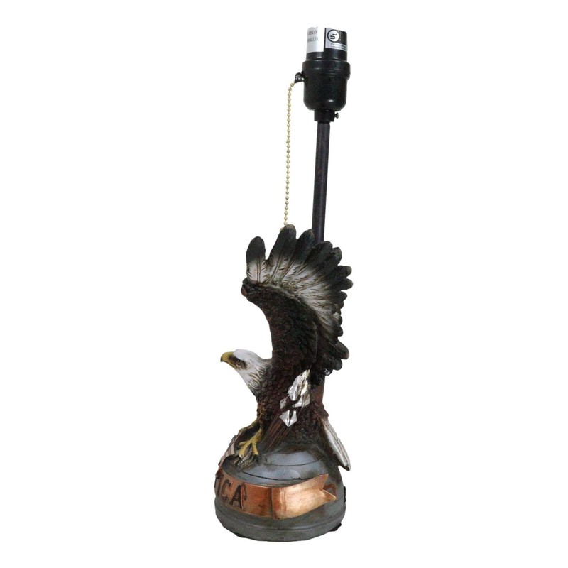 • Upheld for generations as the image of freedom, the American Bald Eagle comes to life in this impressive, finely detailed Table Lamp Sculpture. Featuring a bald eagle with outspread wings, perching on a western USA Flag Star and a banner that reads America. Add style and patriotism to the office, living room, study room or what have you.