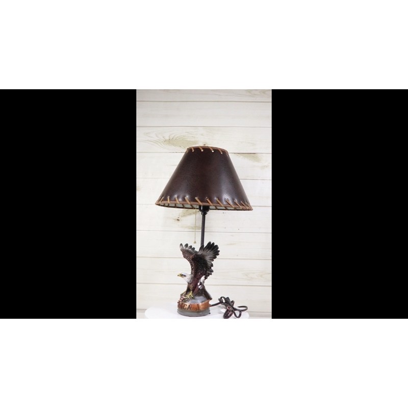 • This Patriotic Bald Eagle With American Flag Star Table Lamp comes with the shade as pictured. Made of polyresin, hand painted and polished, the quality finish is superb! The shade is made of laced paper textured in leather-like finish. The top and bottom fringes of the shade has lace stripes.