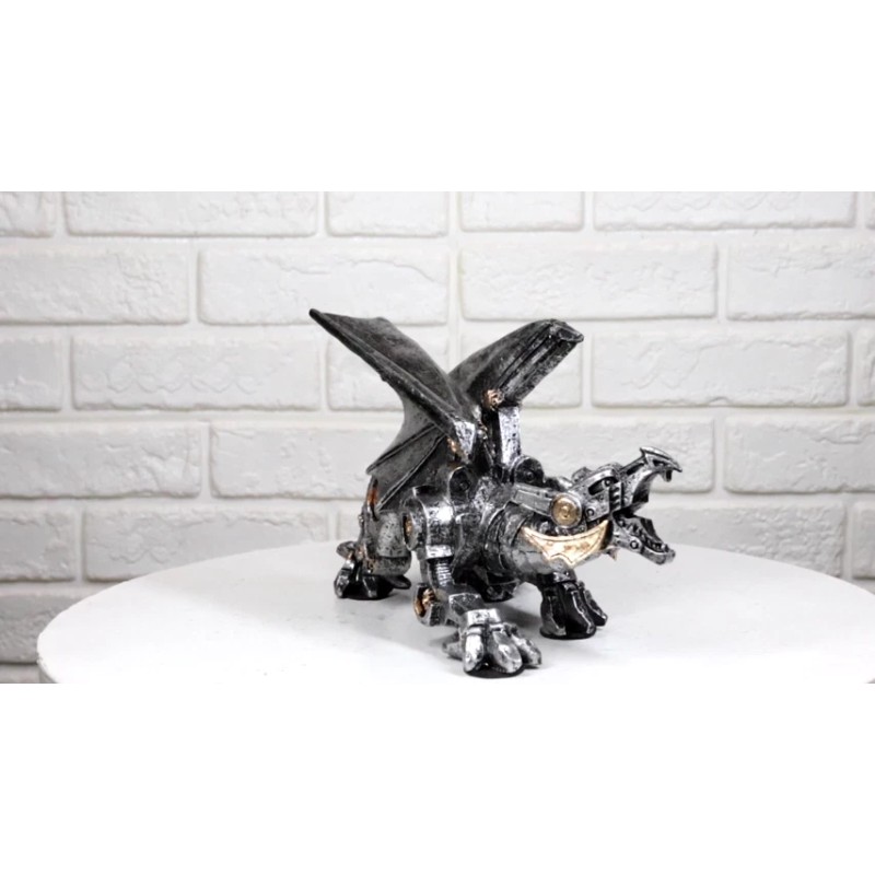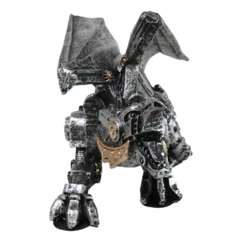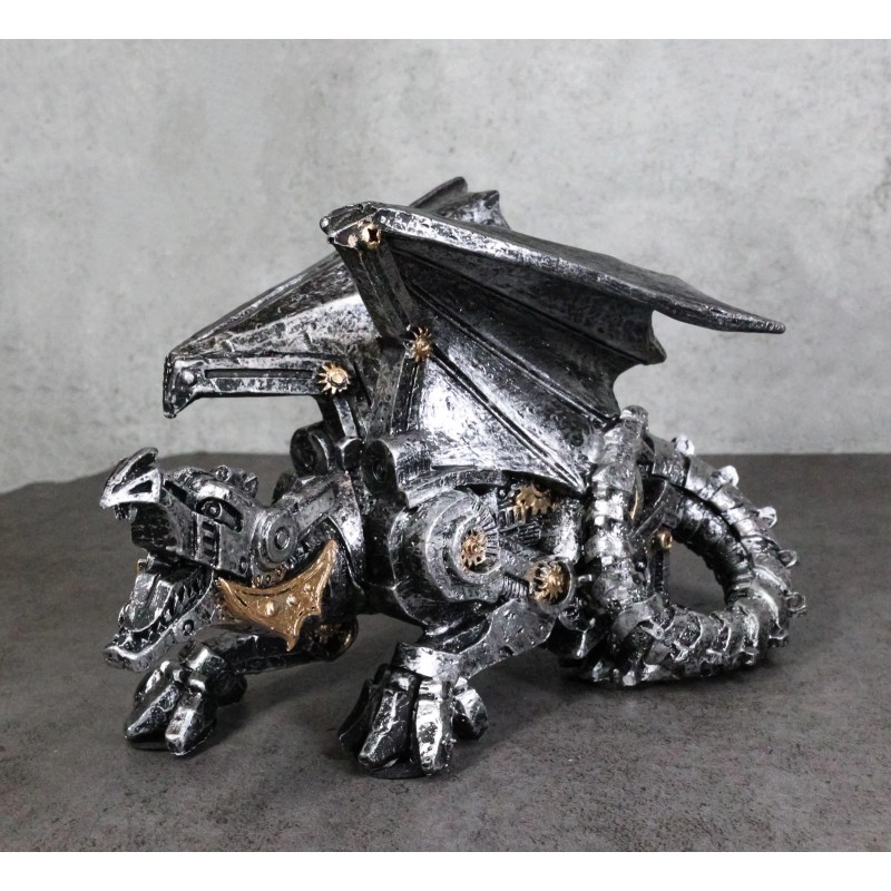 • Unleash the power of innovation and fantasy with the Roaring Steampunk Silver Cyborg Winged Dragon Figurine. This stunning piece merges the mystique of mythical creatures with the mechanical brilliance of steampunk design. Featuring intricate painted on gears, cogs, and metallic detailing, this dragon roars to life with its dynamic pose, wings spread wide and poised for flight. Finished in a striking silver paint, it exudes a futuristic yet vintage aesthetic.