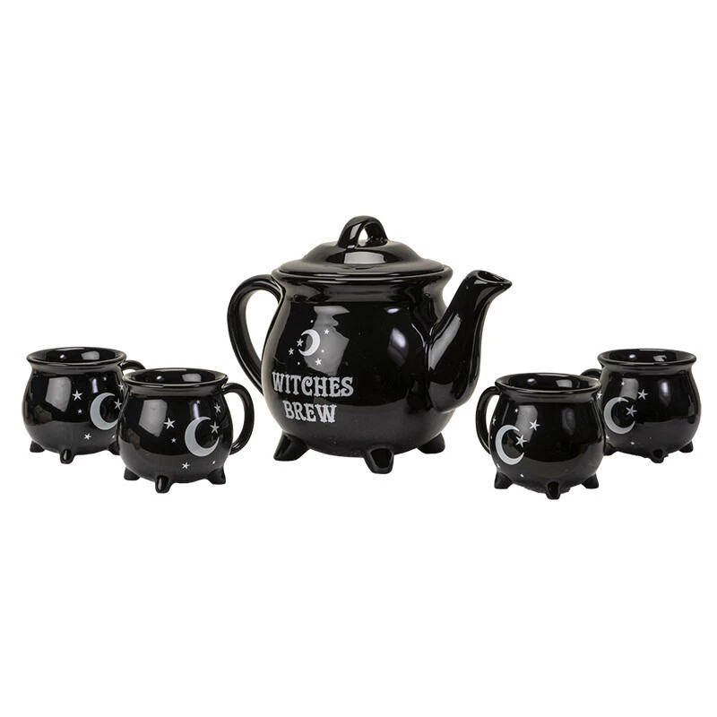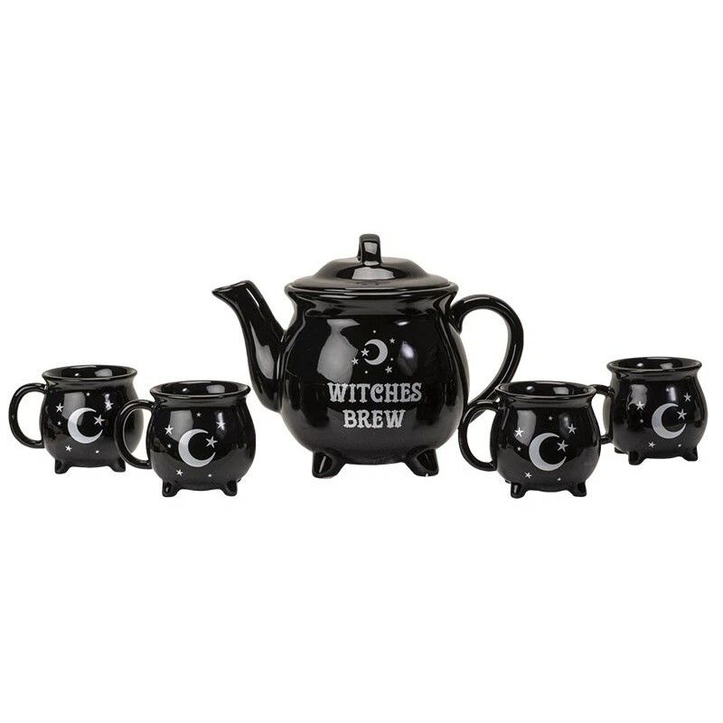 • This enlarged version of our popular Witches Brew Teapot hold multiples cups of tea. A matching set of four cauldron tea cups with little cauldron legs finishes off this mystical tea set that's sure to catch everyone's eye.