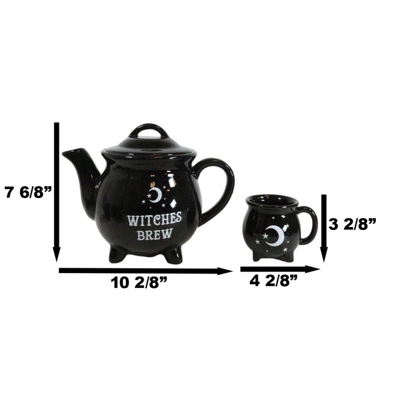 • This Witches Brew cauldron teapot measures 7.5" High, 10.25" Wide and 6.5" in Diameter. The teacups each holds 8 fluid ounces