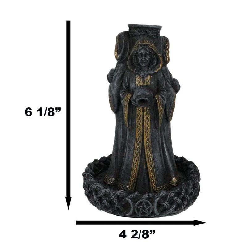 - This Mother Maiden Crone Triple Goddess Backflow Incense Burner measures 6.25" tall, 4.25" deep and 4.25" wide approximately. The sculpture weighs about 14 ounces.