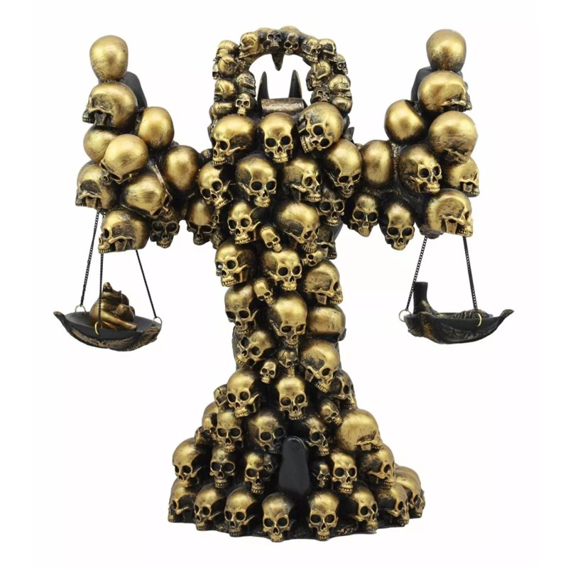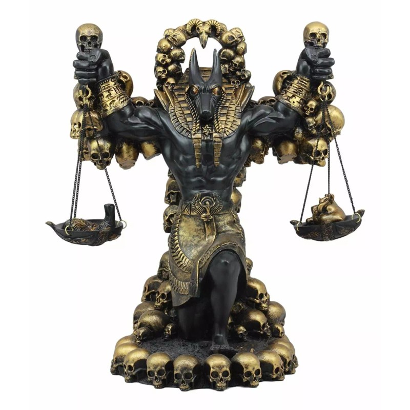 • This figurine depicts anubis in the afterlife, kneeling with scales in his hands, standing by the altar of Ankh which symbolizes the key to the afterlife. Being the God of the dead, you can see skulls all around him. Souls heavier than a feather would be devoured by Ammit, and souls lighter than a feather would ascend to a heavenly existence.