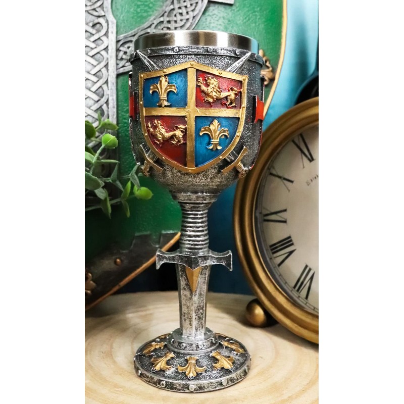 Ebros Lion And Fleur De Lis Coat Of Arms Heraldry Medieval Renaissance Crusader Knight Suit of Armor Drinkware Serveware With Excalibur Sword Handle Stem Decor Accent (Wine Goblet Chalice)