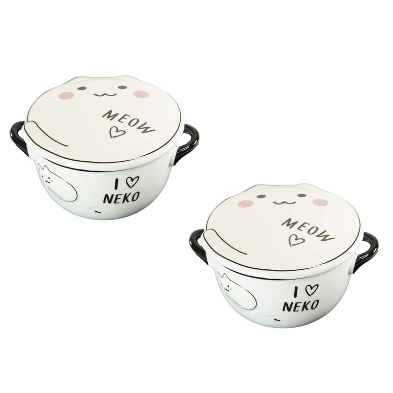 Ebros Pack Of 2 Stoneware Porcelain Cartoon Anime Maneki Neko Cat Noodle Miso Soup Rice Dessert Food Bowls With Lid And Side Handles 25Oz Kids Children Dining Bowl Servewares (White Pink Blushes Neko)