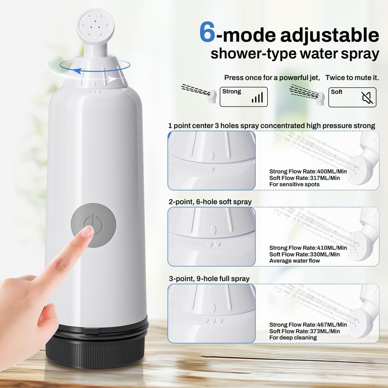 - UNIQUE SHOWER NOZZLE: The unique shower head makes the portable bidet available in 3 different spray modes: 1 with 3 holes to focus on cleaning crevices, 2 with 6 holes to spray gently around the area, and 3 with 9 holes to provide a comfortable and varied cleaning experience.