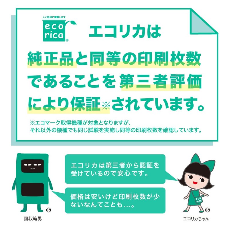 - Eco-Rica is an Eco Mark certified product. Third-party rating guarantees the same page yield as the official product. This product has passed strict standards for quality, safety, and environmental protection