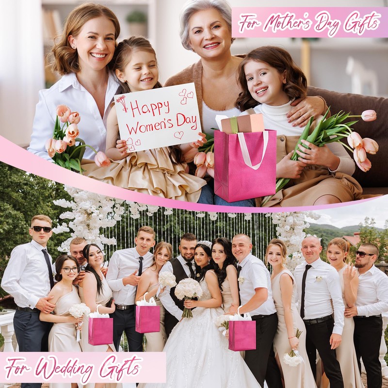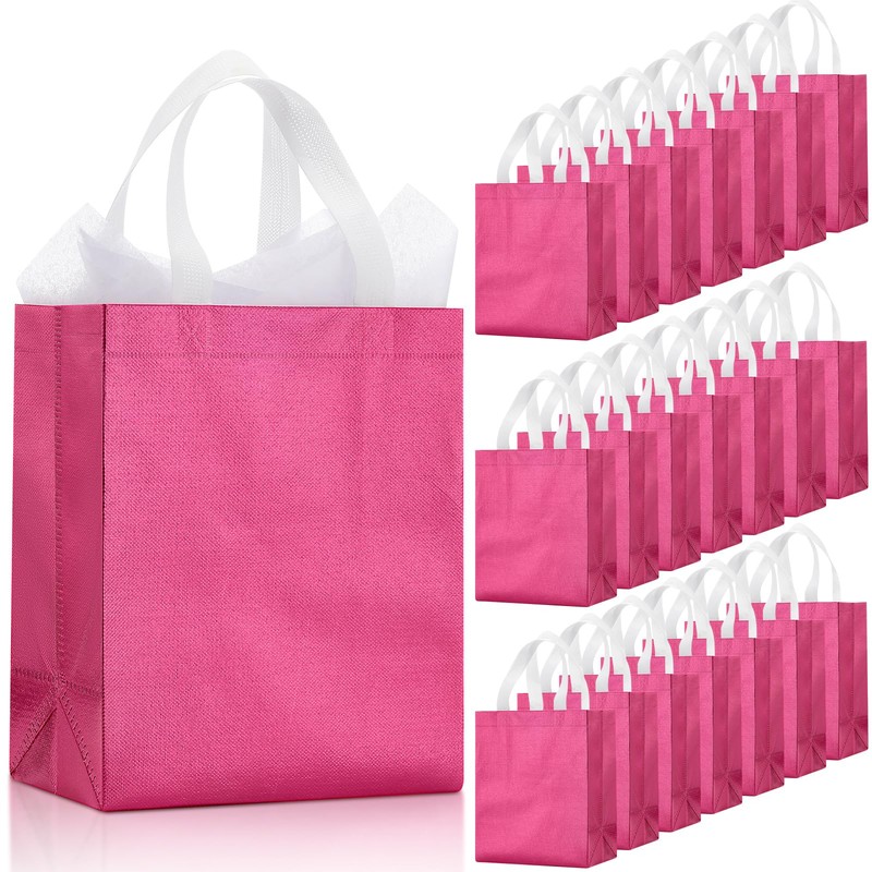 Eccliy 60 Sets Reusable Gift Bags with Tissues Paper,Glossy Non woven Tote Bags with Handles,Bright Grocery Tote Bulk for Wedding, Bachelorette Party (Rose Red)