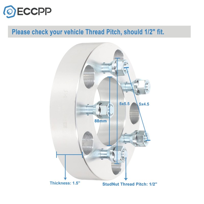 - VERIFY FITMENT--wheel spacers 1.5 inch Even if a vehicle is listed as being compatible, buyers still need to check: 1) Wheel studs are 1/2 threads; 2) You have more than 1.5 inch of space between your fender and your wheel/tire; 3) Your factory wheel studs are shorter than 1.5 inch (NOTE: If your wheel studs are too long, you may need to grind/trim the stud down to fit); 4) Wheel center bore needs to be no smaller than 88mm,advise torque specs at 75-85 Ft/Lbs