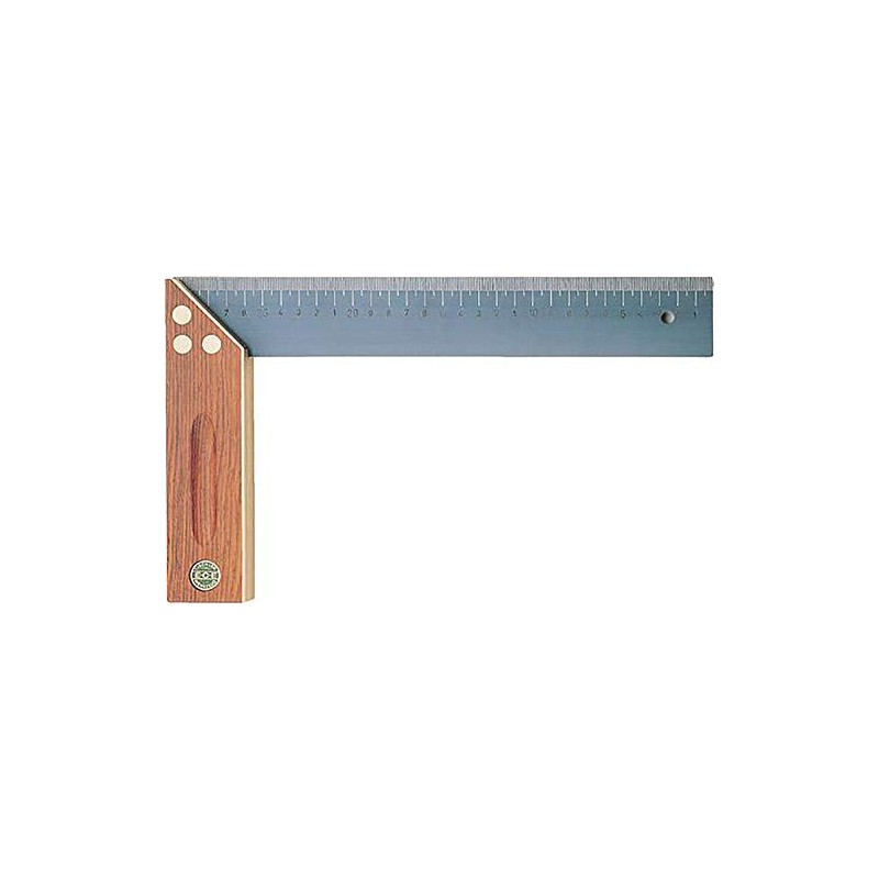 Design: triple riveted, spring-hard blue steel rail and lasered scale. With rosewood legs and chamfer for extra handiness. Double grooved strong brass fitting, with mitre.