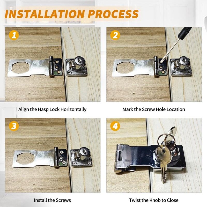 - 【Package Included】The package contains 2 x Twist Knob Locking Hasp, 4 x Keys, 12 x Mounting Screws.Each hasp lock comes with 2 corresponding keys that cannot open the other hasp lock.