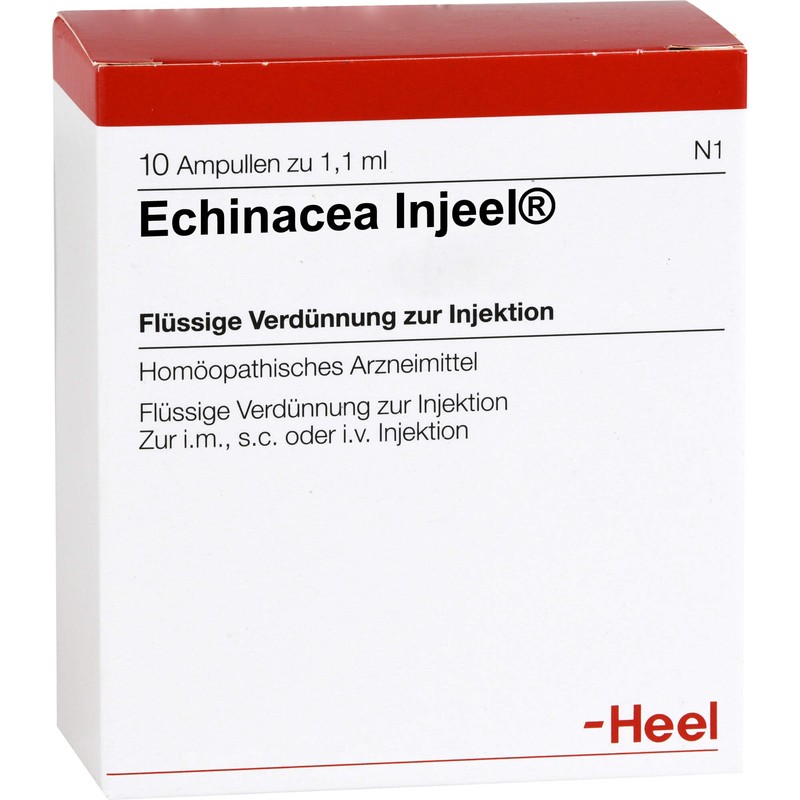 Echinacea-Injeel, Flüssige Verdünnung zur Injektion. Anwendungsgebiete: Registriertes homöopathisches Arzneimittel, daher ohne Angabe einer therapeutischen Indikation.