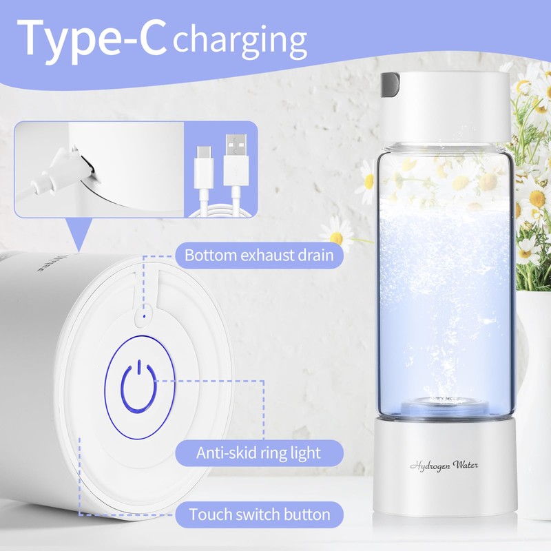 - USB Charge and Easy to Use: Our hydrogen water machine is easy to use,Unscrew the bottom of the cup with itself, remove the plug,you will find that our cup itself with water, because the hydrogen production film needs to be fed with water, you just need to pour out the water, and then loaded with your own water, single-click for the production of hydrogen for 3 minutes, double-click for the production of hydrogen for 10 minutes, the production of hydrogen to complete the automatic stop!