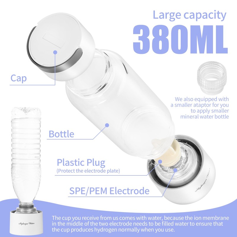 - Large Capacity: With a capacity of 380ml, this hydrogen water bottle generator is perfect for daily hydration. It is made from high quality Borosilicate Glass.