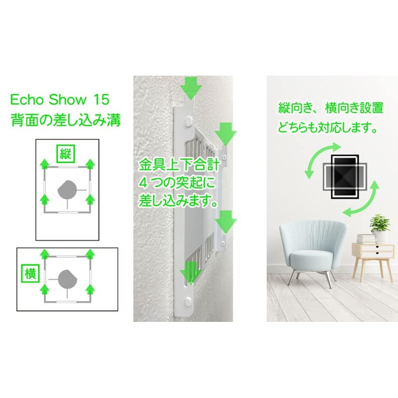 - 金具設置後はEcho Show 15をかけるだけ。縦向き、横向きどちらにも対応。
