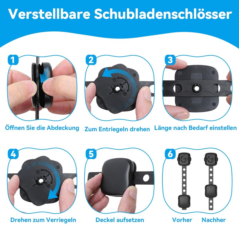 - ADJUSTABLE LENGTH The ECHOCUBE child safety lock is flexible and durable. Simply open the buckle closure to adjust the desired length. It can be adjusted in length to different width door gaps to ensure a tight fit and prevent children from opening the door randomly