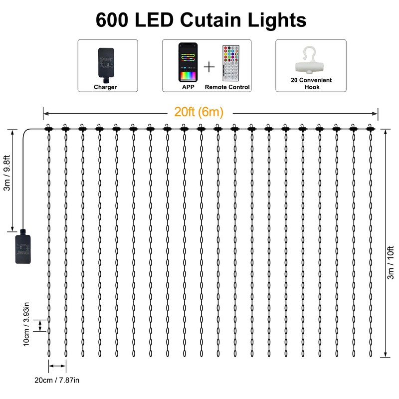 - Enchanting Ambiance: Transform any space into a magical setting with the 20ft x 10ft Smart LED Curtain Lights. Featuring 600 multicolor LEDs, they create an enchanting atmosphere for backyards, weddings, or cozy indoor spaces