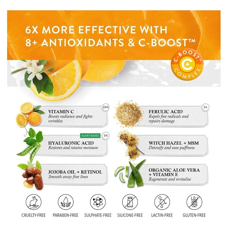 A diferencia de los sueros regulares que contienen muy poca (menos del 15%) vitamina C para tener algún efecto, o demasiada (más del 22%) que causa irritación, el nuestro está formulado con la concentración científicamente óptima de 20% de vitamina C. El ácido hialurónico (5%), ácido ferúlico (1%), aceite de jojoba, MSM, retinol, aloe vera y vitamina E duplican aún más las cualidades fotoprotectoras del suero.