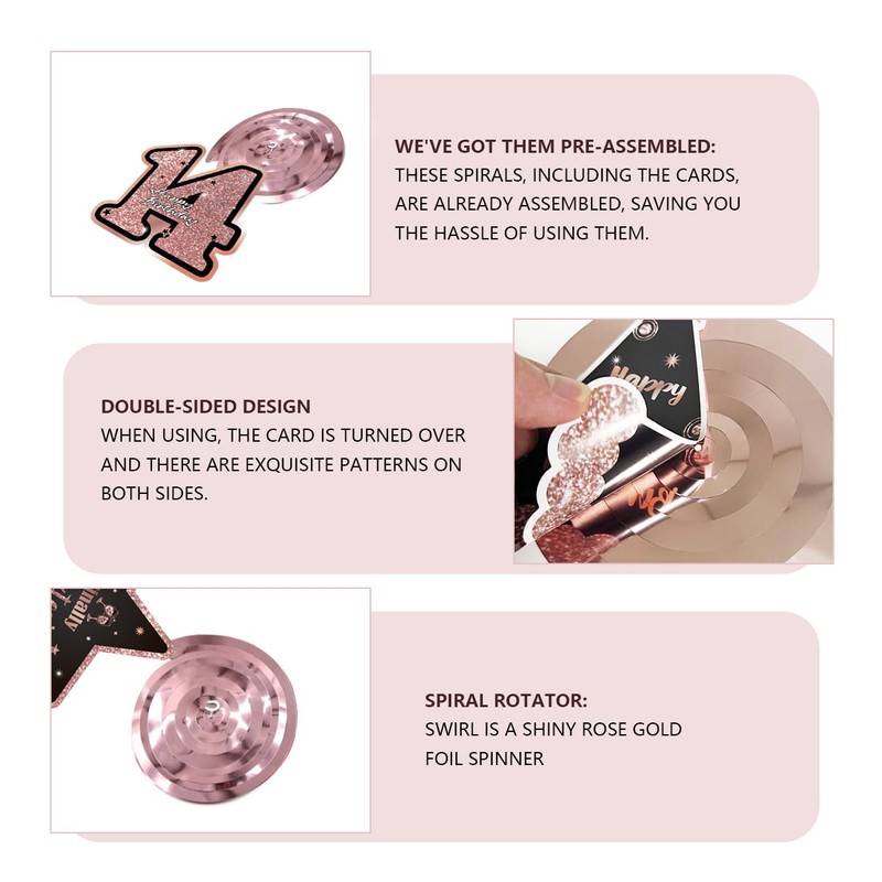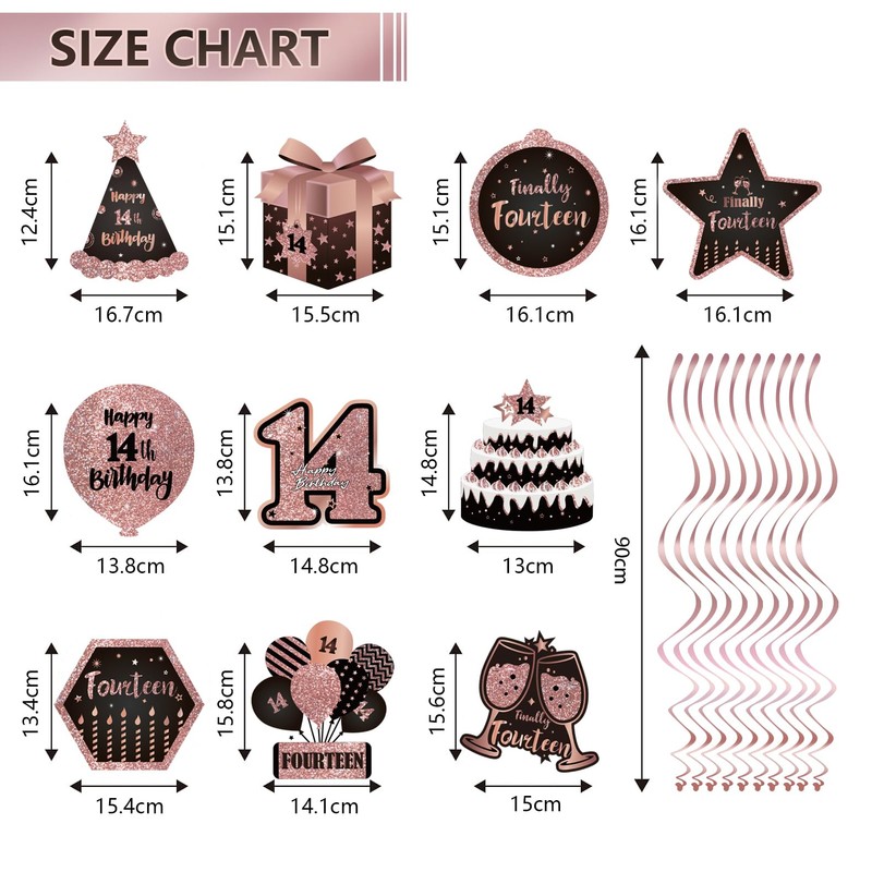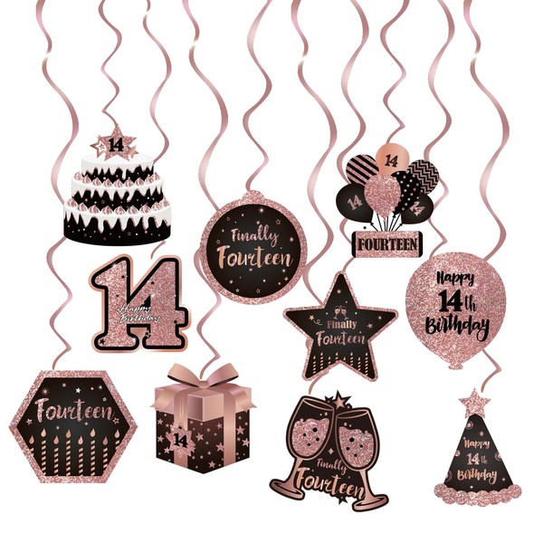 - COMPLETE SET: 10 pieces of rose gold foil hanging swirls with various cutouts including cake, balloons, stars, and champagne glass designs for 14th birthday celebrations