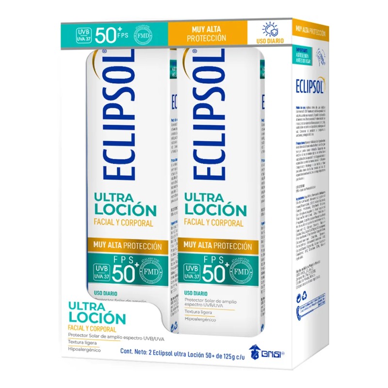 Eclipsol Ultra Loción Protector Solar Facial y Corporal FPS50+, Hipoalergénico, Textura Ultraligera y Resistente al Agua, Uso Diario, 2 Pack de 125 g c/u