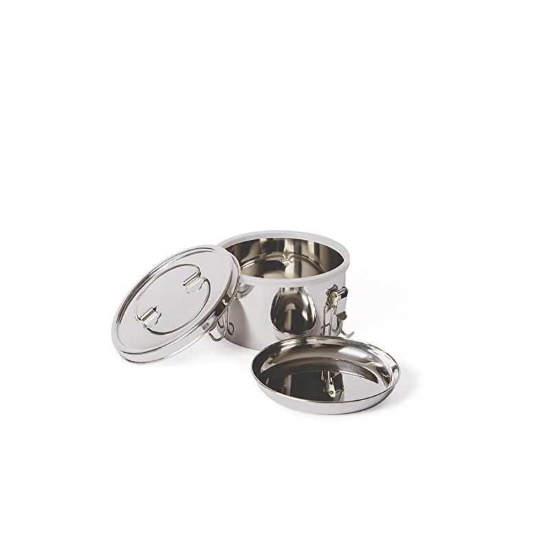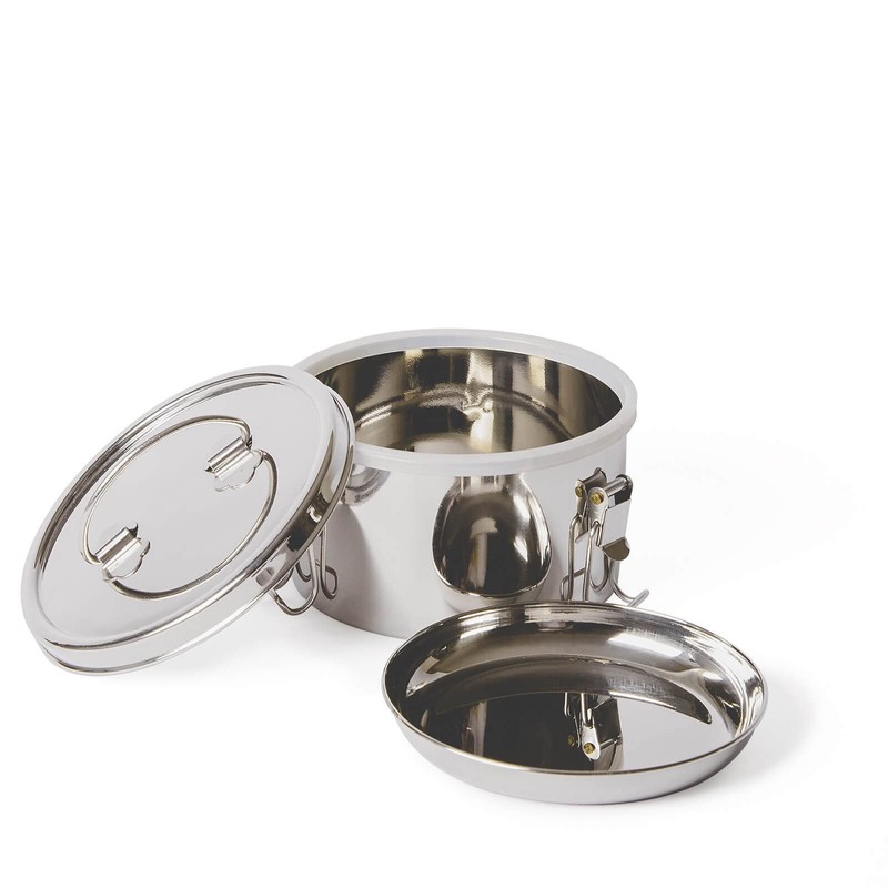 Leak-proof, round lunch box with a large compartment (1.4 litres), high-quality and tested food-safe stainless steel without harmful substances such as BPA, leak-proof thanks to harmless silicone ring, dishwasher-safe. Dimensions: H = 10 cm, diameter = 16 cm.