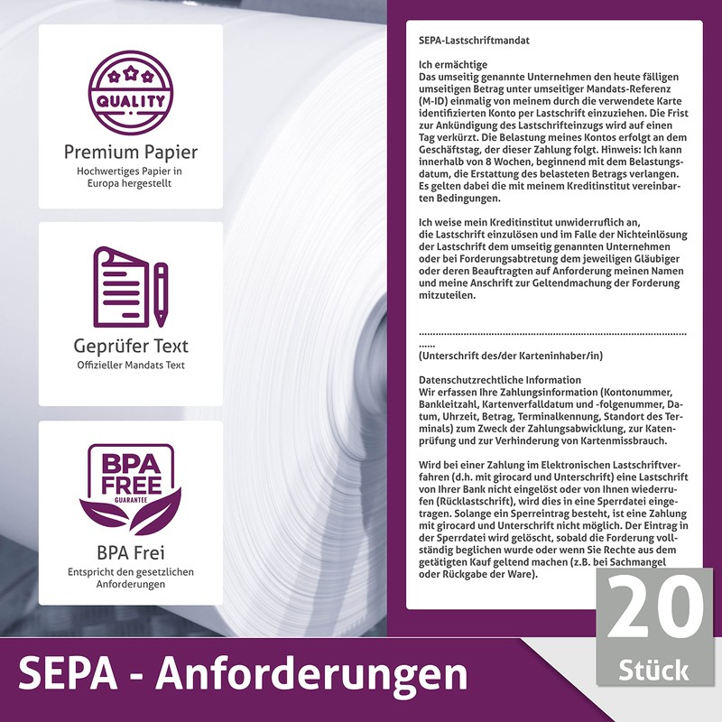 - Box contents: pack of 20 environmentally friendly organic thermal rolls - phenolic free (eco-based blue-grey chemical free thermal paper) with SEPA direct debit text