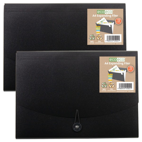 eco-eco A4 50% Recycled 13 Clear Pocket Black Cover Expanding File Organiser - Document Folder - Printed Index Tabs, eco022x2