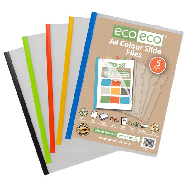 eco-eco A4 50% Recycled Bag 20 Easy Slide Files, Coloured Clip bar Project Re...