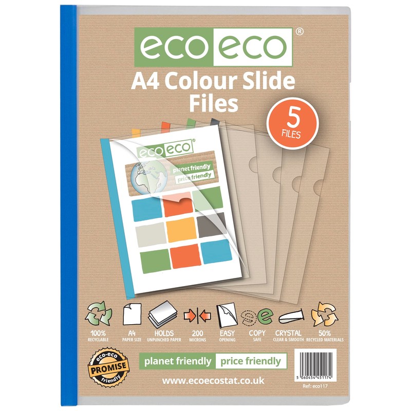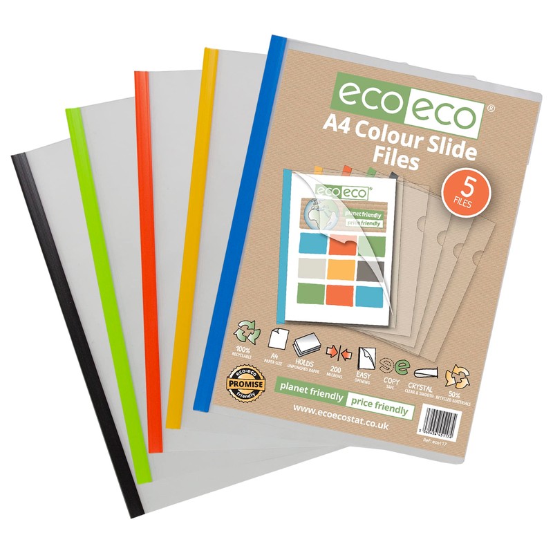 eco-eco A4 50% Recycled Bag 20 Easy Slide Files, Coloured Clip bar Project Report Files, eco117x4