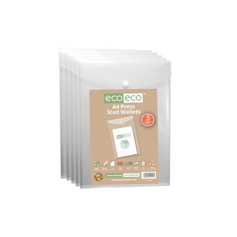 eco-eco A4 50% Recycled Clear Transparent Portrait Press Stud Popper Wallet, Plastic Folders 330x235mm (Pack of 5), 200mic, eco157
