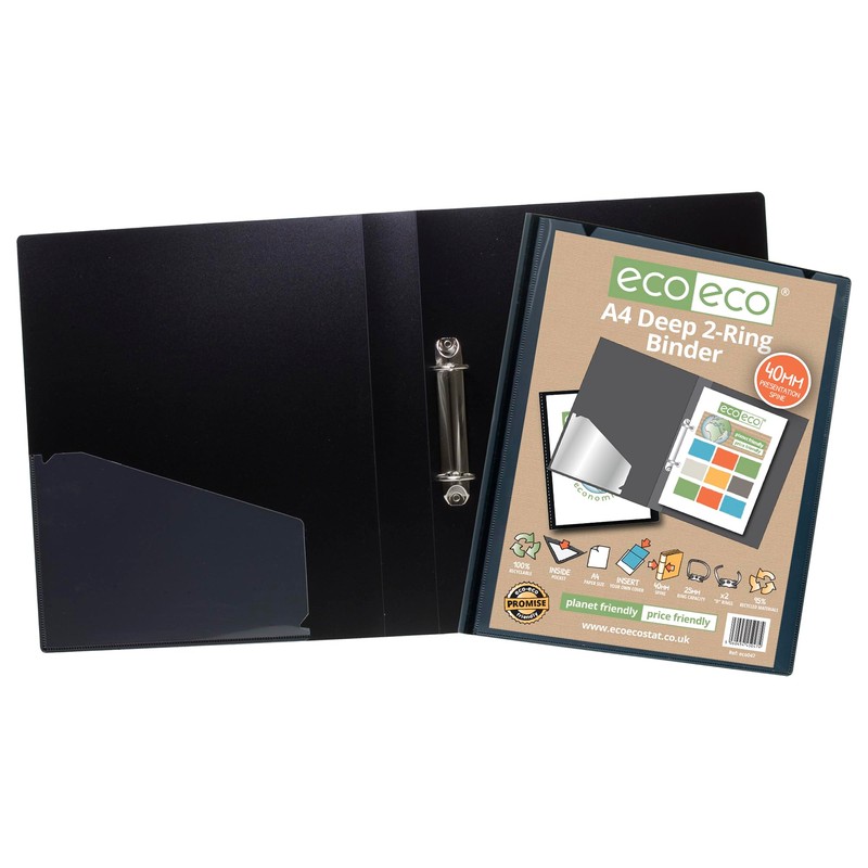 eco-eco A4 95% Recycled Presentation Deep Ring Binder, 40mm Presentation Spine x2 D Rings, Pack of 4 Black, eco047x4