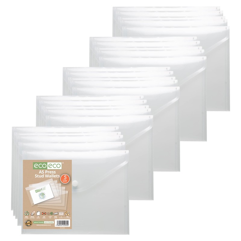 eco-eco A5 50% Recycled Clear Transparent Press Stud Popper Wallet, Plastic Folders (Pack of 25) eco032x25