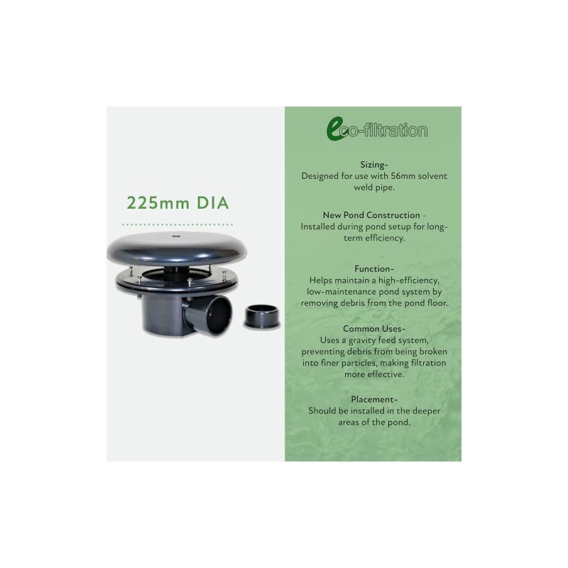 - Efficient Pond Cleaning: The 4” x 2” Bottom Drain and Dome effectively remove debris from the pond floor using a high-flow gravity-fed system for cleaner water.