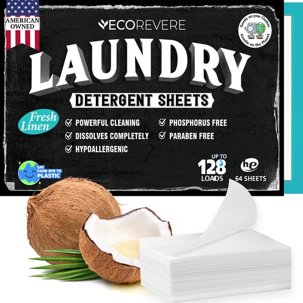 Laundry Detergent Sheets - Eco Friendly Hypoallergenic for sensitive skin, Natural Plant Based Washer Sheets, Travel Laundry Detergent, Harsh Chemical Free Laundry Soap (64 cnt/ 128 Small Loads)