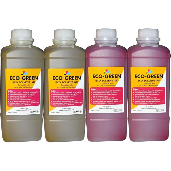 Eco Solvent Ink for Wide Format Commercial Sign Printers, DX4 DX5 DX7 DX9 DX10 DX 11 XP600 TX800 I3200 Printhead, Mimaki, Roland, Mutoh, Will NOT Work with Desktop Printers. (2 Yellow + 2 Magenta)