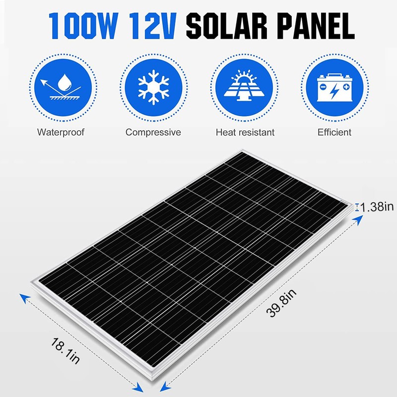 - [Excellent Performance]: 100W Mono Solar Panel with corrosion-resistant aluminum frame, allowing the panels to last for decades as well as withstand high winds (2400Pa) and snow loads (5400Pa). IP65 rated junction box and 21% high cell efficiency.