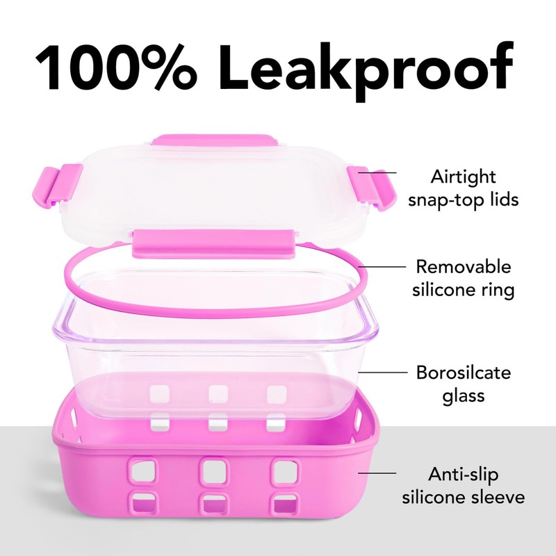 ECOBERI Glass Storage Containers with Lids, 3 Piece Set, 4.5 Cup, Meal Prep, Food Storage, Airtight, Leak-Proof, Safe for Microwave, Freezer, Oven, and Dishwasher (Pink)