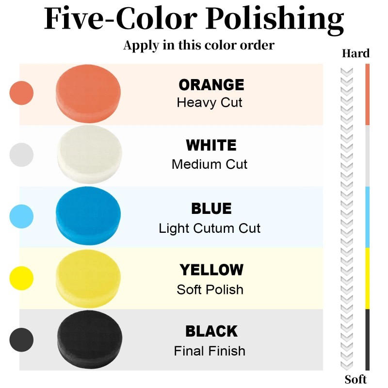 Five-Color Polishing: For different needs, this car polishing pads contain five color-coded sponge pads: yellow for heavy scratches, orange for swirl marks removal, blue for light polishing, white for soft polishing, and black for waxing and finishing. These pads effectively repair wear for a precise and efficient polish