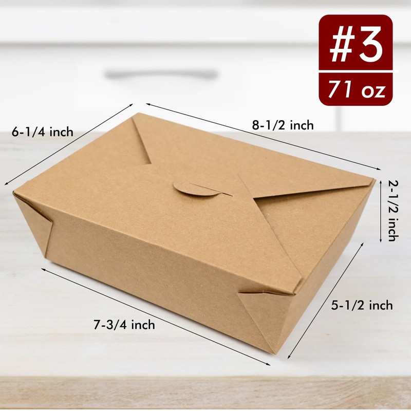 - · Size and Capacity: 200 packs (50x4) of Kraft fold to go food containers. Top size: 8-1/2 x 6-1/4 Inch, bottom size: 7-3/4 x 5-1/2 inch, height: 2-1/2 inch. Each box can hold up to 71oz (2100ml).