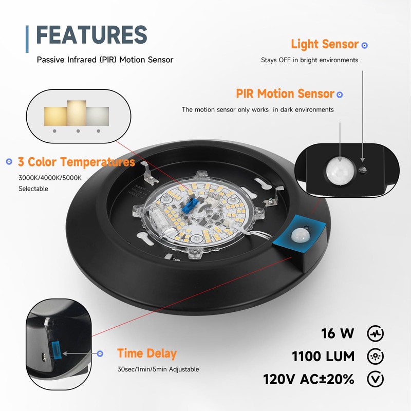 Lights on when you need them—automatically. The built-in PIR motion sensor detects movement within 9–16 ft and turns off automatically after a delay of 30 seconds, 1 minute, or 5 minutes. Ideal for stairways, hallways, closets, bathrooms, and garages where manual switches are inconvenient.