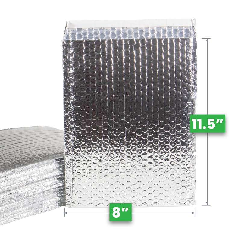 - 100-PACK THERMAL BUBBLE MAILERS 8 in x 11.5 in - Our bubble mailers are 3/16" thick and made of thermal radiant foil with poly bubble liner. Has seams for safe packaging. Reflects 96% to hold the temperature for food sensitive items during shipment.