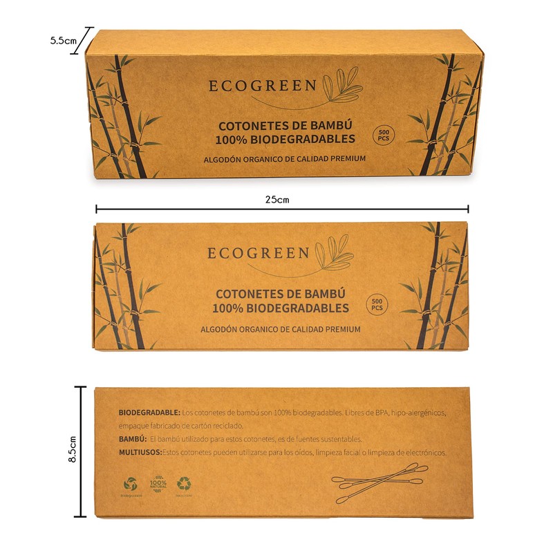 EcoGreen® - Caja con 500 cotonetes, fabricados de bambú, 100% biodegradables y ecologicos.
