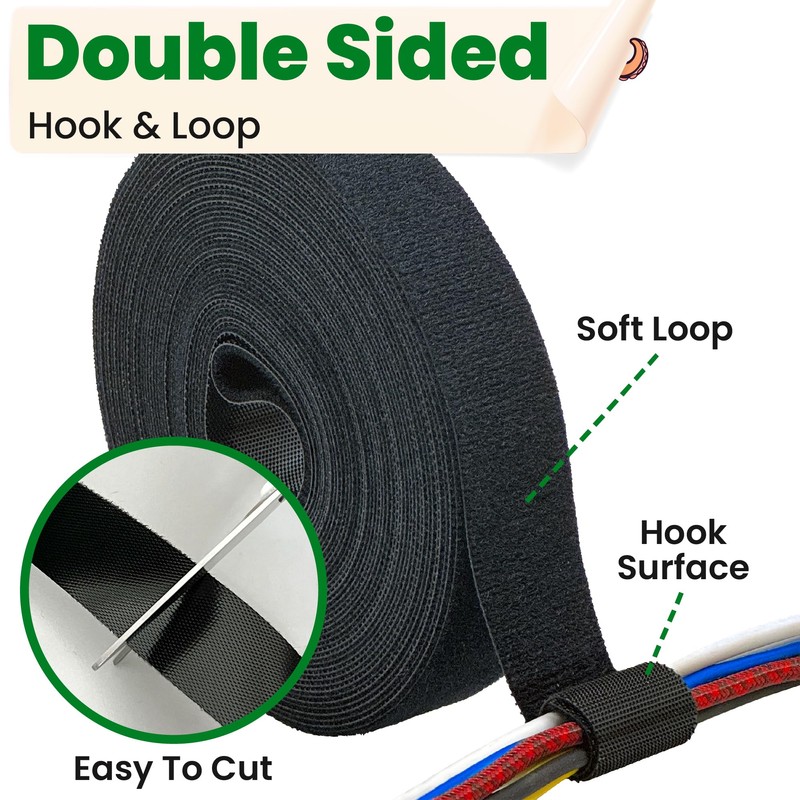 • GREAT FOR CABLE MANAGEMENT - Simply cut to length from the tape roll for your various needs. Wrap the tape around your cables, and the double-sided hook and loop strips will securely adhere to each other. This reusable tape allows you to adjust the tightness as needed or repurpose it for different items.