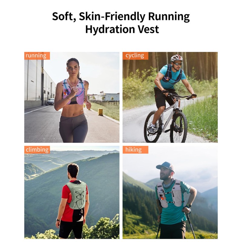 - 【Plenty of Storage】 Multi-pocket hydration backpack provides you with plenty of space to store your belongings. Your 500ml soft flasks, phone, key, money, food can be easily stored in the front pocket, and the 2L hydration bladder, towels, clothes or other items can be placed in the back pocket. Both the main zipper pocket and the front zipper pocket are made of waterproof fabric to ensure your clothes and phone stay dry.