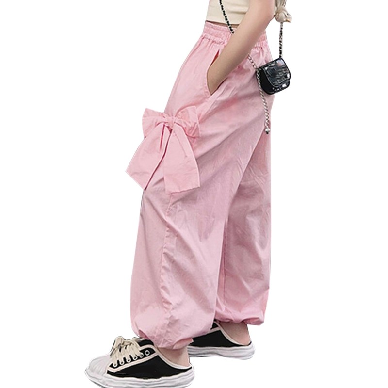 Parachute pants for girls with bow that can be worn with T-shirts, tank tops, blouses, sweatshirts, knitwear, sweaters, hoodies, jackets and various tops.