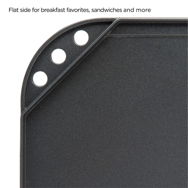 - VERSATILE REVERSIBLE GRILL AND GRIDDLE- Cook large meals on either side of this reversible grill/griddle. Use the ribbed side for grilled foods, like steaks or chicken, or use the flat griddle side for a variety of your favorite foods like pancakes, bacon and eggs