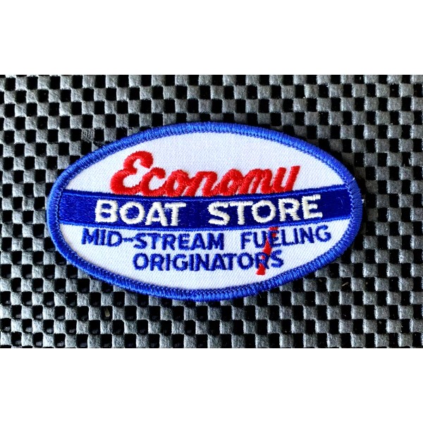 Embroidered patch ECONOMY BOAT STORE ~ MID-STREAM FUELING ORIGINATORS TO THE BARGE TRANSPORTATION INDUSTRY SINCE 1936 4" x 2 1/4" oval sew or iron on in very good condition. Please use the pictures to help you determine condition and see all the details of this awesome patch. Notice the intricate and brilliant colors and threads. This patch was never sewn on to a garment. 51230822.
