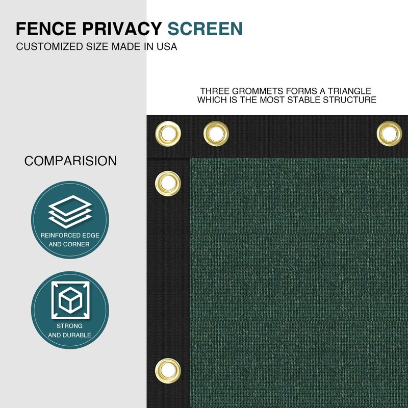 - REINFORCED CORNERS WITH GROMMETS: This fence screen has 3 grommets on each corner, more grommets are placed along all edges, 12" apart vertically, 24" apart horizontally. A heavy duty 1.5" black binding around each edge provides additional stability when it is attached to the fence.